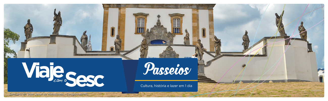 1 dia: Embarque no Sesc Palladium: R. Rio de Janeiro, 1046, Centro - Belo Horizonte com acompanhamento de guia de turismo com destino a Congonhas para visita ao famoso Santuário de Bom Jesus de Matosinhos, Patrimônio Mundial da UNESCO desde 1985. Ao chegar, visita ao conjunto arquitetônico formado pela Basílica Bom Jesus de Matosinhos que possui a imagem do Senhor Morto, 12 esculturas em pedra-sabão representando os profetas e 6 capelas que abrigam cenas da Paixão de Cristo esculpidas em madeira e tamanho natural, todas produzidas pelo mestre Antônio Francisco Lisboa, Aleijadinho. Almoço Livre ( não incluído). Após almoço, visita guiada ao Museu de Congonhas. Inaugurado em dezembro de 2015, o moderno museu propõe mediação entre o Santuário e o público, trazendo sua história e manifestações de fé, como as romarias e os ex-votos. Tempo livre para apreciar as exposições e visitar as lojas de artesanato nas imediações do Santuário. Às 16 horas, retorno a Belo Horizonte e chegada no mesmo local de embarque.